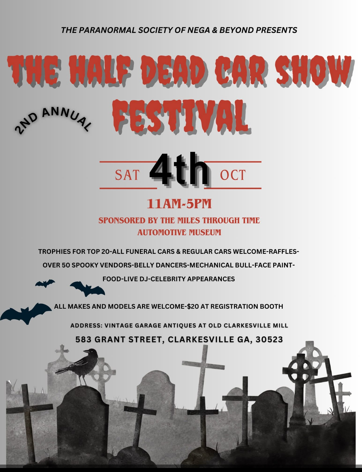 The Half Dead Car Show Festival TROPHIES FOR TOP 20-ALL FUNERAL CARS & REGULAR CARS WELCOME-RAFFLES- OVER 50 SPOOKY VENDORS-BELLY DANCERS-MECHANICAL BULL-FACE PAINT- FOOD-LIVE DJ-CELEBRITY APPEARANCES ALL MAKES AND MODELS ARE WELCOME-$20 AT REGISTRATION BOOTH